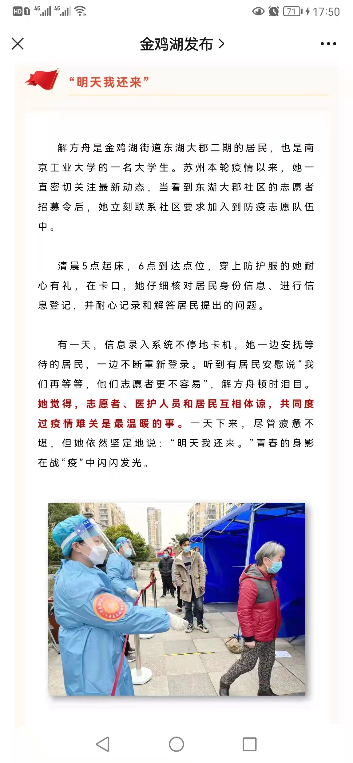 园林1901班解方舟密切关注最新动态,当看到东湖大郡社区的志愿者招募令后,立刻联系社区要求加入到防疫志愿队伍中。清晨5点起床,6点到达点位,穿上防护服的她耐心有礼,在卡口,她仔细核对居民身份信息、进行信息登记,并耐心记录和解答居民提出的问题。有一天,信息录入系统不停地卡机,她一边安抚等待的居民,一边不断重新登录。听到有居民安慰说“我们再等等,他们志愿者更不容易”,解方舟顿时泪目。她觉得,志愿者、医护人员和居民互相体谅,共同度过疫情难关是最温暖的事。青春的身影在战“疫”中闪闪发光。