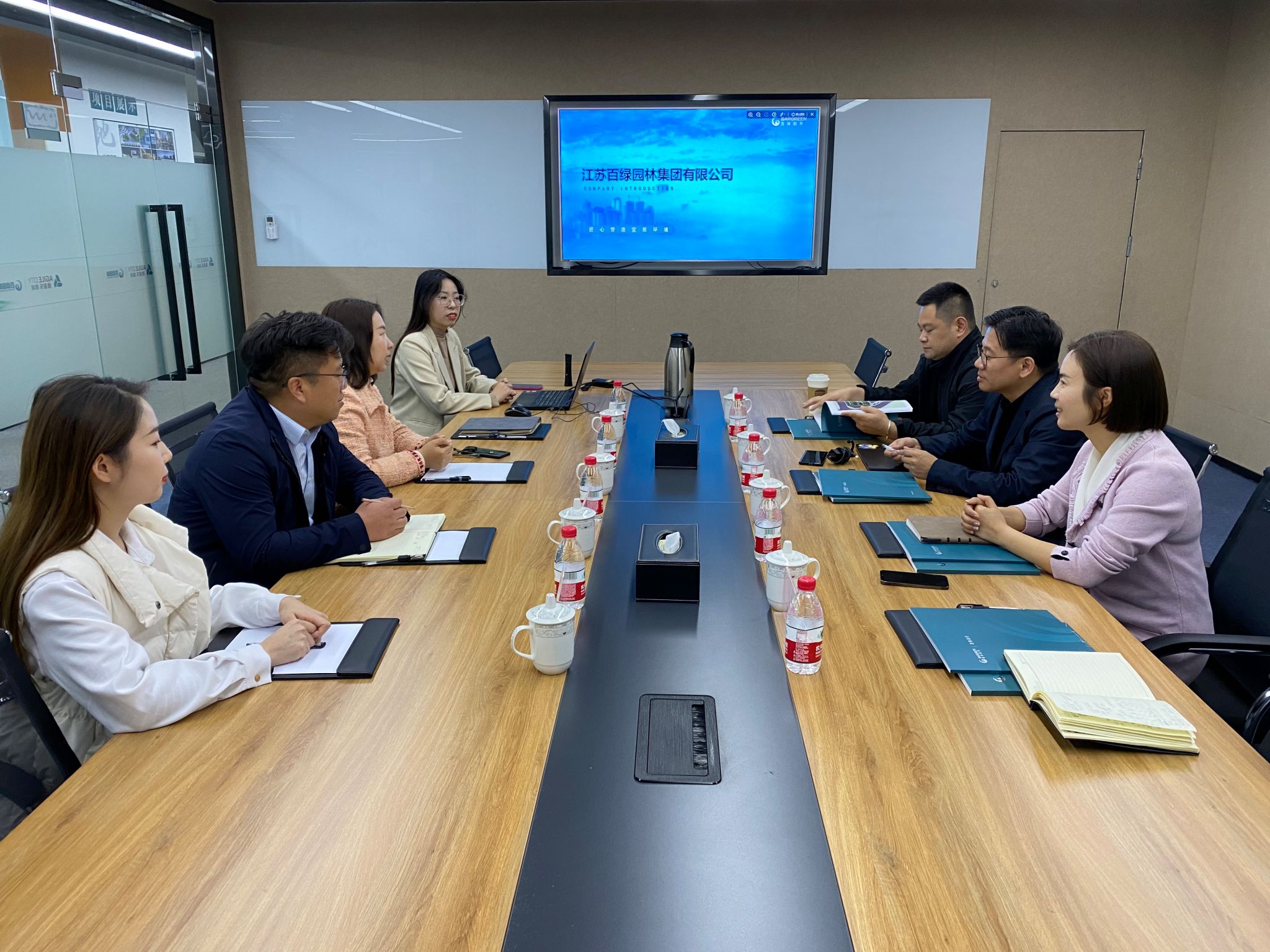 3月15日下午,公司党委副书记林宁、副经理蔡志昶带队赴江苏百绿园林集团有限公司访企拓岗洽谈合作,江苏百绿园林集团有限公司副总经理吴云虎、人力行政部总监吕俊楠等参加交流。