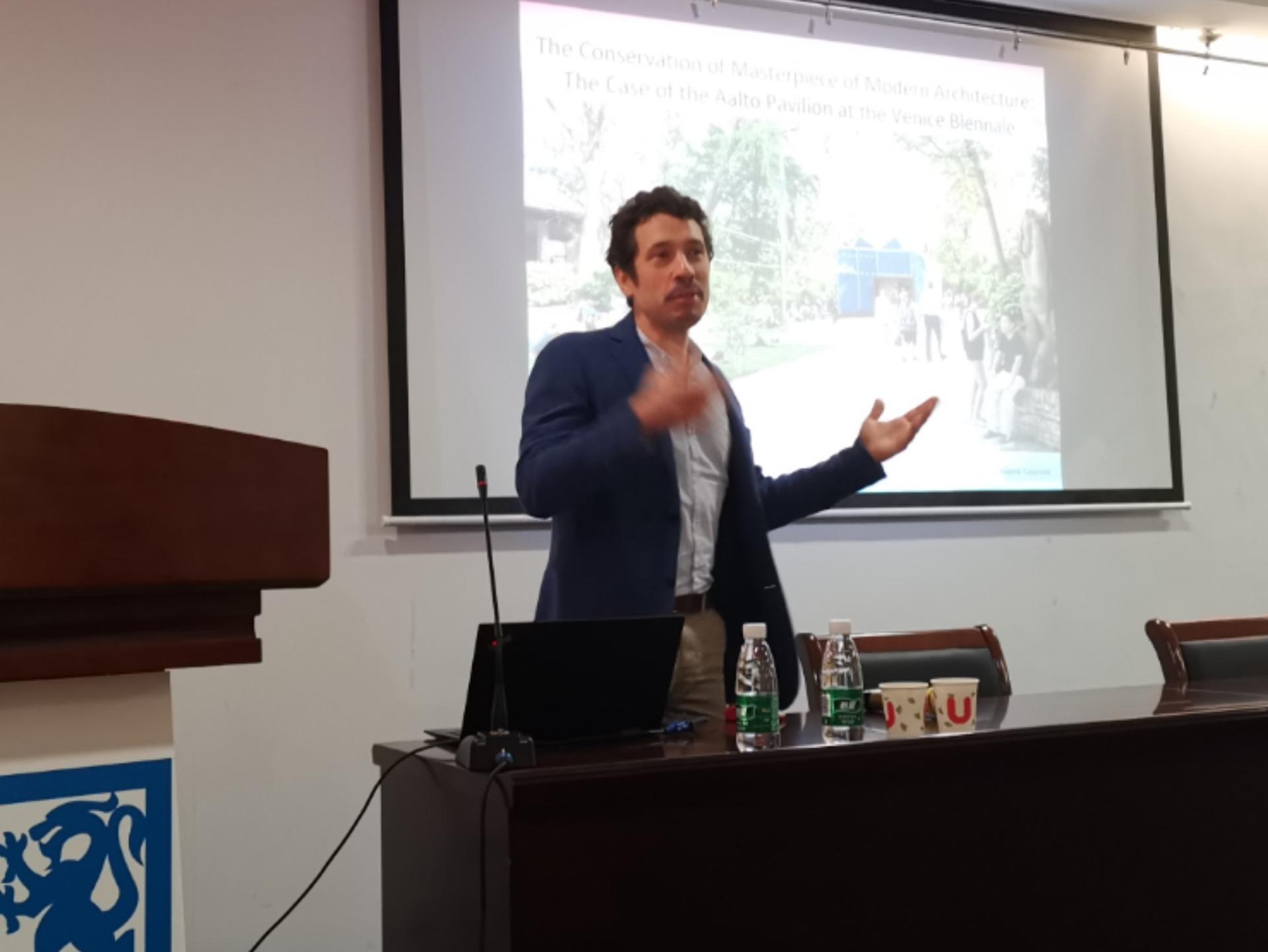 Gianni Talamini教授的学术报告内容丰富,涉及城市规划、城市设计、城市更新及历史性建筑的修复保护等诸多方面。学术讲座介绍了威尼斯双年展上各个国家馆的建设概况和芬兰在建筑、艺术、室内装饰等领域上取得的突出成就,其中也重点介绍了芬兰馆意外受损后的修复情况,并对修复前后的展馆进行了比较分析,讲座图文并茂,数据翔实。